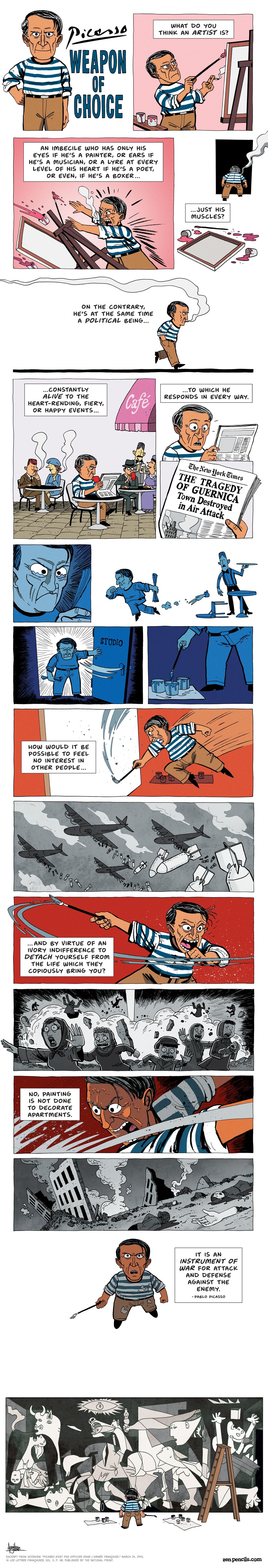 Para representar mejor este suceso, el sitio Zen Pencils realizó la siguiente tira en la que se muestra un fragmento de la entrevista Picasso no es un oficial en el ejército francés (Picasso n’est pas officier dans l’
