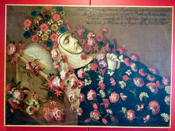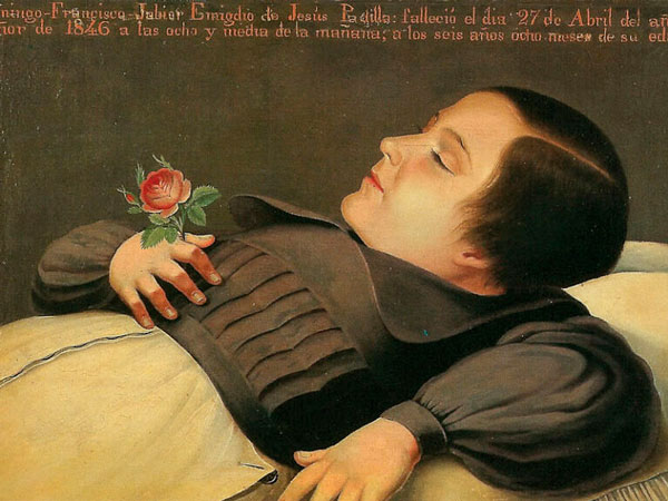 Es importante mencionar un pequeño antecedente, pues al igual que en Europa, en la entonces Nueva España, a partir del siglo XVII, se cultivó la pintura mortuoria entre las élites, ya que ellos era los únicos que podían pagar los elevados precios. Dentro de dichas obras se encuentran retratos como los de las monjas coronadas fallecidas, donde se observan a las mujeres, algunas jóvenes y otras de edad avanzada, recostadas plácidamente sobre sus camas aparentando estar dormidas, ataviadas con sus hábitos y emblemas distintivos de sus órdenes. También se encuentran los famosos retratos de infantes muertos, que representaban la tradición de “la muerte niña”[3], pues se les retrataba bajo la simulación de estar dormidos.