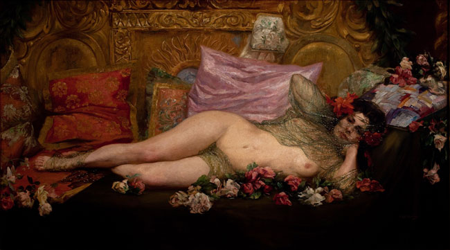 Dentro de la basta producción que tuvo Gedovius, se mencionará una de sus obras más conocidas y reproducidas: Desnudo Barroco (1920), obra en la que se retoma uno de los tópicos clásicos por excelencia, la representación de Venus. En esta obra se observa a una bella y joven mujer desnuda recostada sobre su costado izquierdo en un diván estilo Nouveau mientras sostiene una tela transparente tipo organza, la cual rodea y cubre sensualmente su cuerpo y cara. En la pintura, se aprecia no sólo la exquisitez del montaje y selección de color, también el foco central: el manejo sutil del trapeado de la tela, pues la manera en la que cubre el dorso, brazo y rostro es impactante, al igual que permitir que el espectador observe los ojos penetrantes de la joven a través de ella.
