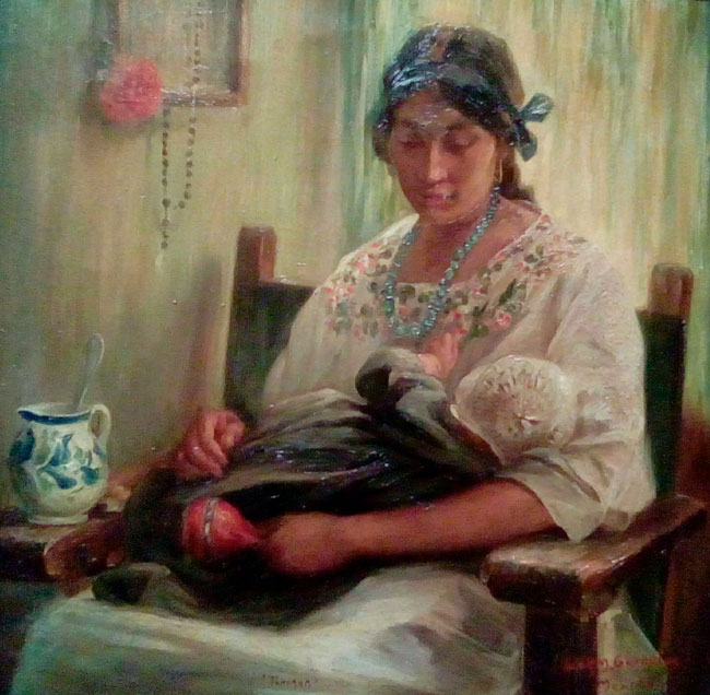 Como se ha mencionado, las obras de Germán son el claro ejemplo de la educación formal europea donde los referentes culturales son completamente diferentes a los que se tienen en México, así como su gran capacidad de adaptación e implementación de los tópicos nacionales de la época, es decir, los temas relacionados con el indigenismo e hispanismo. Muestra de ello es la obra llamada Tehuana en el que se aprecia a una mujer de rasgos indígenas que abraza (muy probablemente amamanta) a un bebé con vestimenta occidental que reposa en sus brazos.