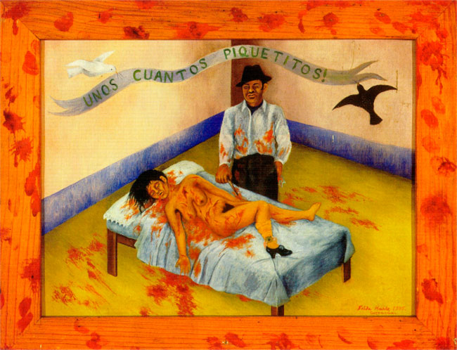 Una de las obras más reconocida, polémica y comentada de Frida Kahlo tiene precisamente esta estructura. Unos cuantos piquetitos es la representación de un feminicidio real, cuyo título tiene su origen en la declaración del culpable: “Sólo fueron unos cuantos piquetitos”. Si atendemos a la imagen, nos daremos cuenta que la falta de perspectiva, la tosquedad de las figuras, la irrealidad y hasta la infantil representación de los brotes de sangre sólo apuntan a la desaprobación tanto de la pintura como del acto en cuestión, ya que incluso la escena no muestra o narra una solución sacra, sino que se limita a la visceral y cruda realidad.